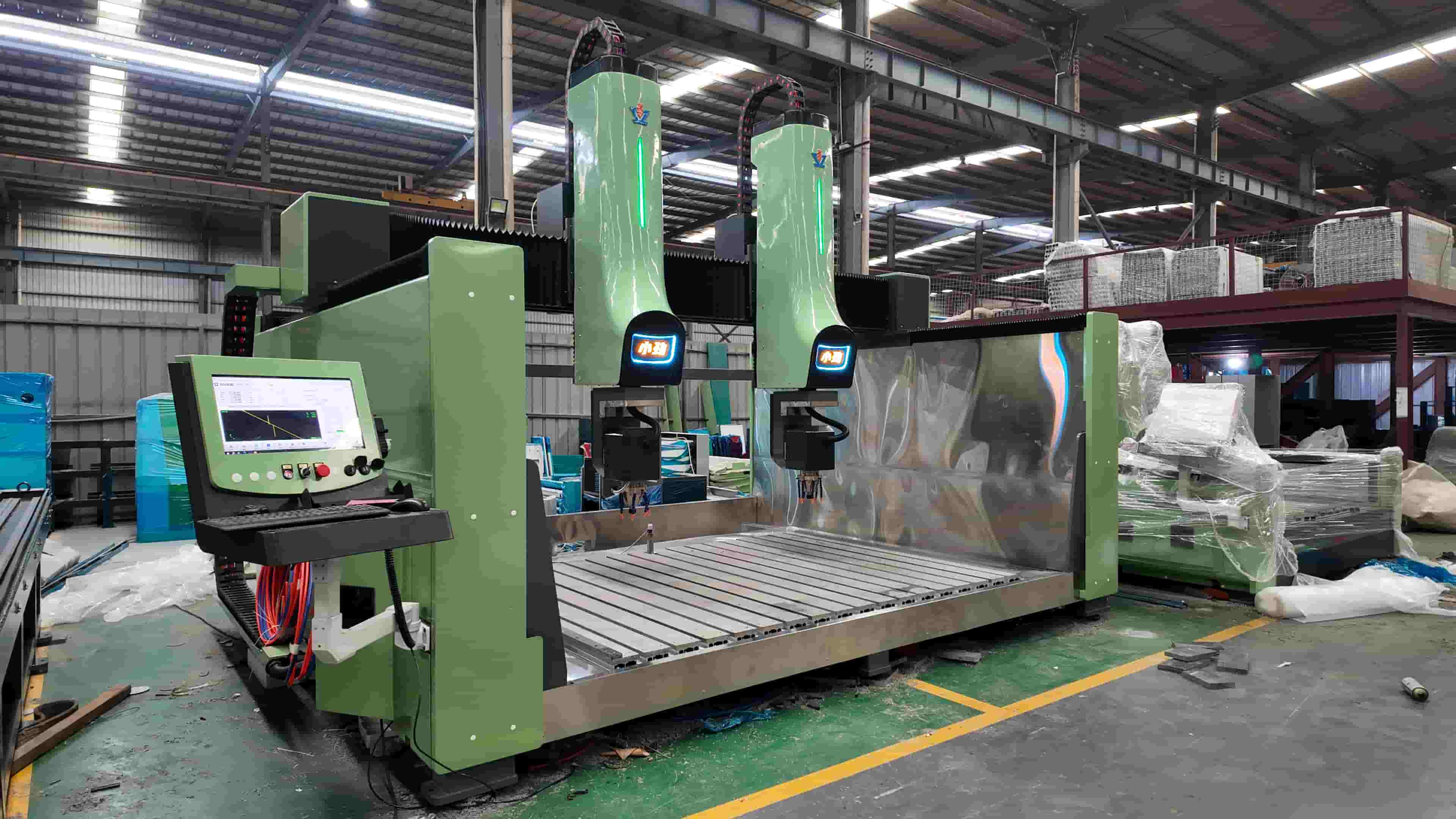 Отличительной особенностью этого станка является двухголовочная конфигурация в сочетании с полноценным 5-осевым механизмом. Эта комбинация выводит гравировку по камню от простой поверхностной резьбы до полноценной 3D-скульптуры, непрерывной многогранной обработки и глубокой многоугловой детализации. Два шпинделя могут: