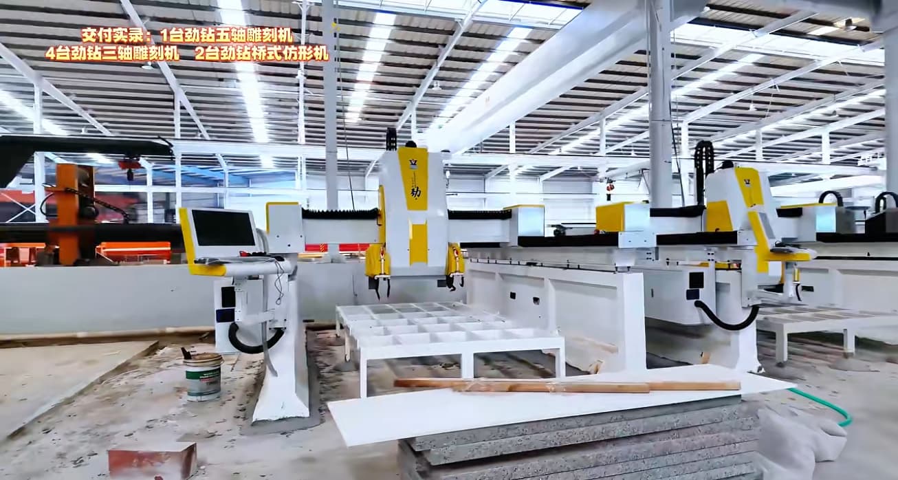 The delivery included one 5-axis CNC stone engraving machine, four 3-axis CNC engraving machines, and two bridge-type profiling machines, all installed to support high-efficiency stone fabrication.